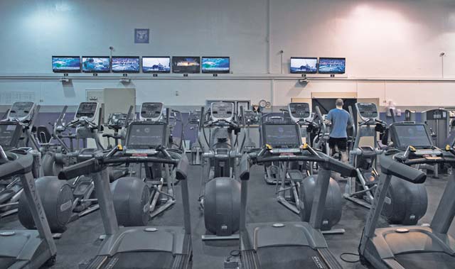 A fan watches Super Bowl XLIX while working out Feb. 1 at the Ramstein Northside Fitness Center.