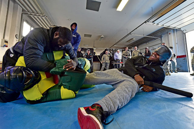 Carolina Panthers players practice law enforcement submission techniques during a visit to the 569th U.S. Forces Police Squadron March 7 on Kapaun. According to the USO, the Carolina Panthers organization is an avid supporter of service members, frequently including them in their game-day activities and even reserving a row of honor for service members to sit in at every home game.