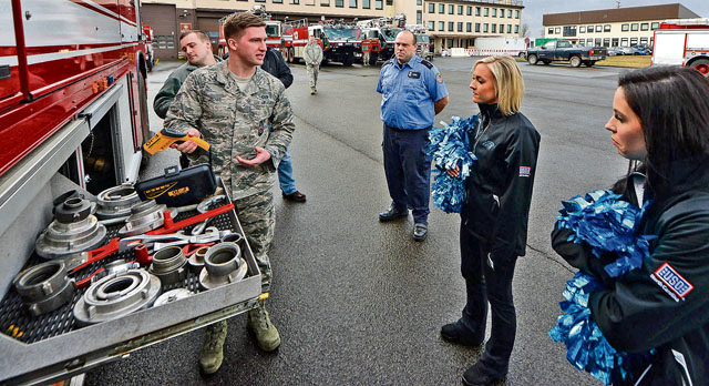 Senior Airman Stephen Bowe, 86th Civil Engineer Squadron firefighter, explains uses of the many tools on board a fire engine to Carolina Panthers Top Cat cheerleaders Chandalae Lanouette and Megan Schlosser March 7 at Fire Station One on Ramstein. While visiting Fire Station One the players and cheerleaders were allowed to view a simulated building fire response.