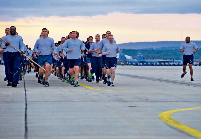 Airmen from the 86th Comptroller Squadron run in formation while singing jodies during the third tri-wing run of the year Sept. 3, 2015, on Ramstein. The regularly scheduled tri-wing runs are one of the few times all three wings on Ramstein come together to form Team Ramstein.