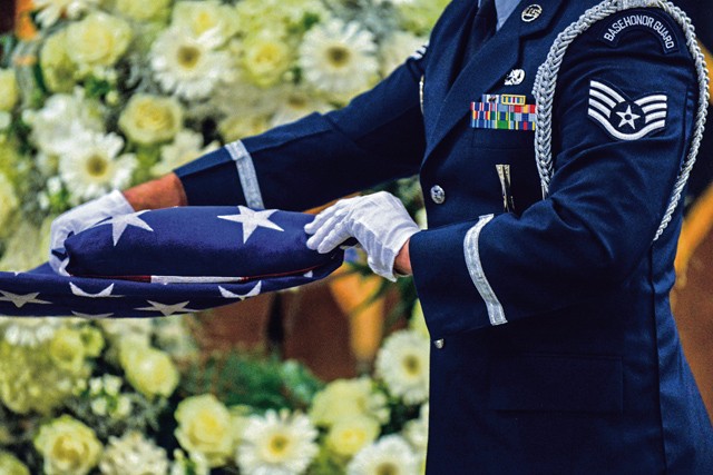A Ramstein honor guardsman folds the U.S. flag during a Prisoner of War/Missing in Action wreath-laying ceremony Sept. 16, 2015, on Ramstein. After the folding of the flag, retired U.S. Air Force Col. Joseph Milligan spoke about his experiences as a prisoner of war.