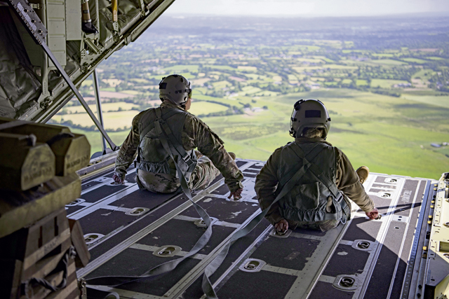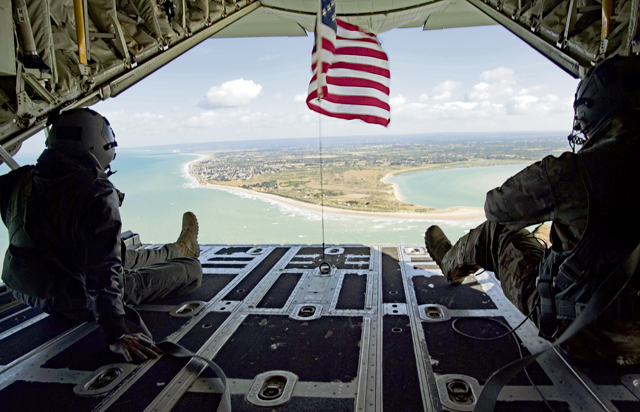 U.S. Air Force Airmen gaze across the countryside from a C130J Super Hercules aircraft ramp on June 6. Seventy-six years ago, Allied Forces stormed the beaches of Normandy, France, as part of the largest multinational amphibious landing and operational military airdrop in history. Photo by Airman 1st Class Jennifer Gonzales