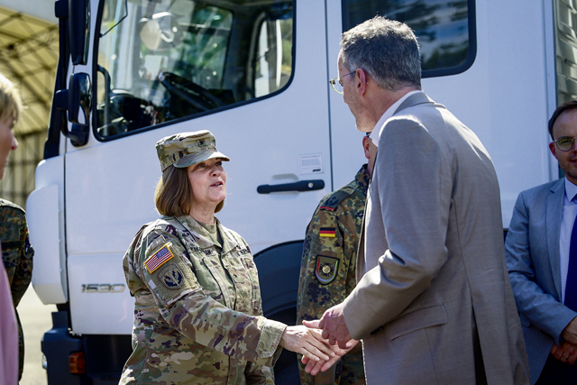 Brig. Gen. Karen Monday-Gresham, deputy commanding general, 21st Theater Sustainment Command, shakes hands with Markus Cappel, maintenance manager, Theater Logistics Support Center-Europe, during Rheinland-Pfalz State Minister Michael Ebling’s visit to the Maintenance Activity Kaiserslautern, on July 8, 2024, Kaiserslautern Army Depot, Germany. The MAK consists of well-trained maintenance specialists that provide field and sustainment maintenance for wheeled, tracked and all other automotive equipment and components in support of sustainment, deployment, re-deployment and reset of the U.S. Army in Europe. The visit helped to increase knowledge of local and regional logistic services as well as highlight collective sustainment capabilities within the European theater.