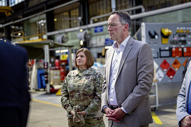 State Minister Michael Ebling, Rheinland-Pfalz Ministry of Interior and Sports, observes maintenance being conducted during his tour of the Maintenance Activity Kaiserslautern, July 8, 2024, on Kaiserslautern Army Depot, Germany. During his visit, Minister Ebling also toured the Supply Activity Europe and visited a static display hosted by the 6966th Truck Transportation Terminal. The visit helped to increase knowledge of local and regional logistic services as well as highlight collective sustainment capabilities within the European theater.