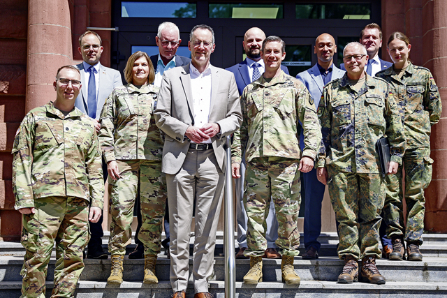State Minister Michael Ebling (middle left), Rheinland-Pfalz Ministry of Interior and Sports, poses for a group photo with Kaiserslautern Military Community staff during his visit on Panzer Kaserne, Germany, July 8, 2024. During his visit, Minister Ebling sat down with Brig. Gen. Karen Monday-Gresham, deputy commanding general of the 21st Theater Sustainment Command, and toured the Maintenance Activity Kaiserslautern. The visit helped to increase knowledge of local and regional logistic services as well as highlight collective sustainment capabilities within the European theater.