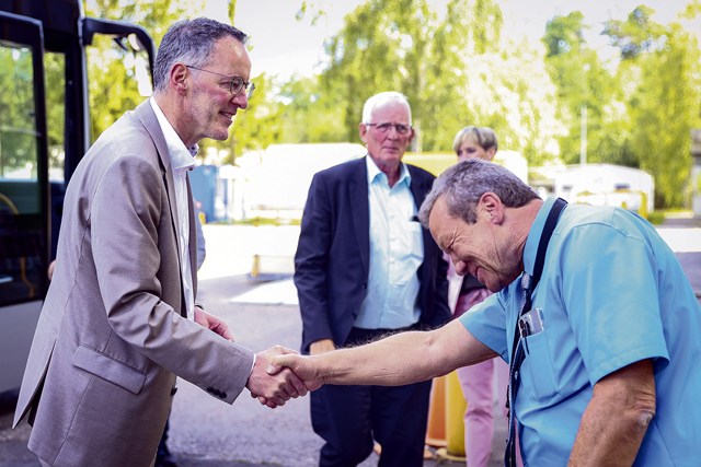 State Minister Michael Ebling, Rheinland-Pfaz Ministry of Interior and Sports, shakes hands with Markus Cappel, maintenance manager, Theater Logistics Support Center-Europe, during his visit to the Maintenance Activity Kaiserslautern, on July 8, 2024, Kaiserslautern Army Depot, Germany. The MAK consists of well-trained maintenance specialists that provide field and sustainment maintenance for wheeled, tracked and all other automotive equipment and components in support of sustainment, deployment, re-deployment and reset of the U.S. Army in Europe. The visit helped to increase knowledge of local and regional logistic services as well as highlight collective sustainment capabilities within the European theater. (Photos by Sgt. Andrew Jo)