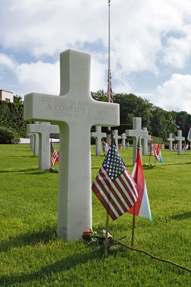 A rose lies next to an unmarked grave during a memorial service at the Luxembourg American Cemetery and Memorial May 26.