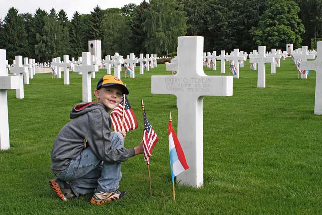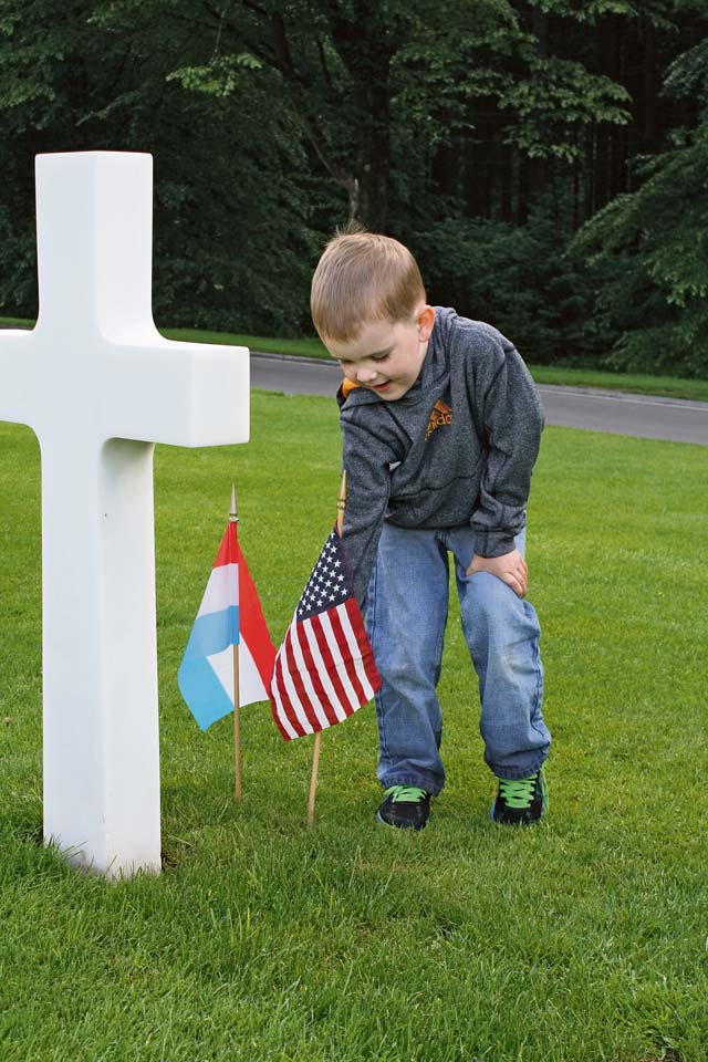 Lucas Webb, a Cub Scout from Pack 243 and son of Tech. Sgt. Robert Webb, 86th Airlift Wing Public Affairs NCO in charge of broadcasting, plants a flag during a memorial service at the Luxembourg American Cemetery and Memorial.