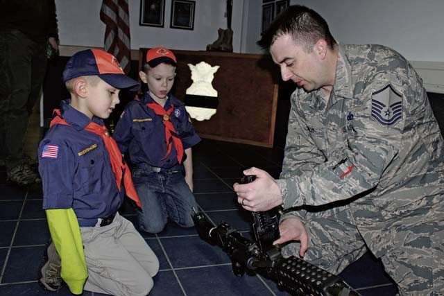 Master Sgt. Gregory Riley, 86th Security Forces Squadron NCO in charge of police services, shows Cub Scouts an M240B Machine Gun Feb. 3 on Ramstein. Airmen from the 86th SFS gave local Cub Scouts a tour of their facilities and taught them about some of the weapons they might carry.