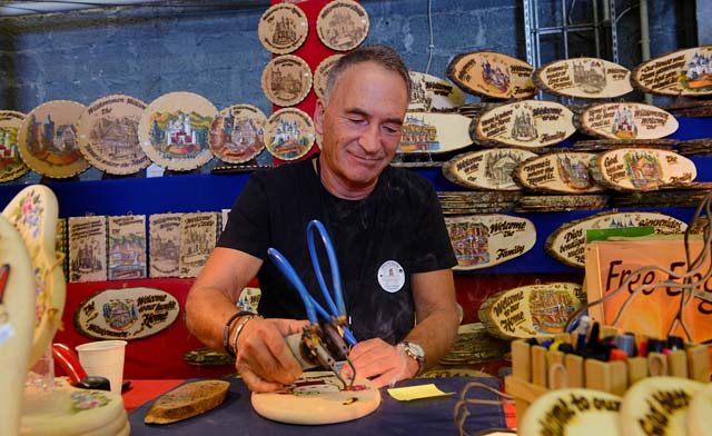 Martin Reimlinger engraves a piece of wood Sept. 19, 2015, on Ramstein. Reimlinger was one of many vendors present at the 51st Ramstein Bazaar to showcase his merchandise.