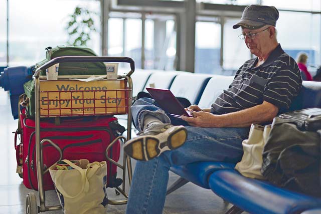 A retiree sits and waits for a Space-A flight May 10 in the Ramstein Passenger Terminal.