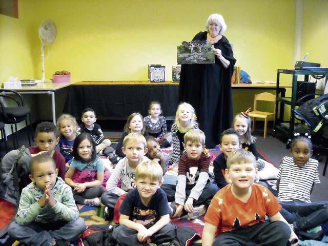 Alexis Boyanowski brings her students monthly for story time to the Landstuhl Library. Shawn Friend-Begin reads one to two books to Boyanowski’s Kindergarten students. Alexis Boyanowski’s Kindergarten students smile into the camera, and Friend-Begin shows off the pop-up book she read to the students. — Photos by Alexis Boyanowski