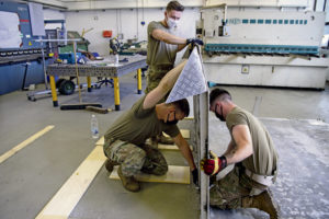 Senior Airman Dyllan Greer, Airman 1st Class Tyler Sellitto, Airman 1st Class Austen Campbell, and local national Thomas Spies, have been working diligently to calculate and construct ramps fabricated from aluminum diamond-plated metal in order to smoothly load BCUs such as a Negatively Pressurized Conex for the 10th Expeditionary Aeromedical Evacuation Flight’s COVID-19 mission.