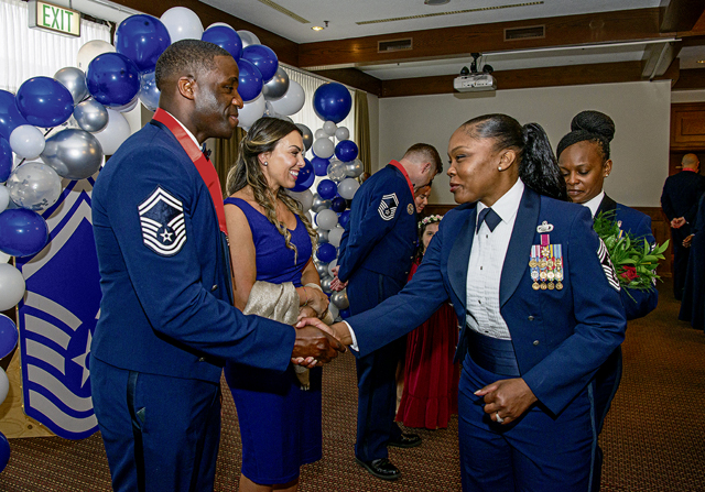 U.S. Air Force Chief Master Sergeant selects and their spouses are congratulated by 86th Airlift Wing leadership after being presented with a medallion at a Chief Recognition Ceremony, Ramstein Air Base, April 15. The ceremony acknowledged the accomplishment of joining the top one percent of the enlisted force. Photos by Airman 1st Class Regan Spinner
