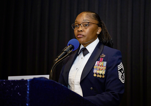 U.S. Air Force Chief Master Sgt. Charmaine Kelley, 86th Airlift Wing command chief, speaks at a Chief Recognition Ceremony, Ramstein Air Base, April 15. Kelley spoke of the many roles of a Chief, and the difference between being a Chief and being an E-9.