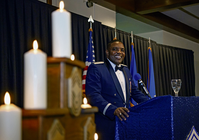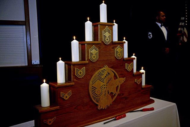 Lit candles sit above U.S. Air Force enlisted ranks during a Chief Recognition Ceremony, Ramstein Air Base, April 15. The candle lighting ceremony represents how each enlisted rank is important to an Airman’s journey to Chief Master Sgt.