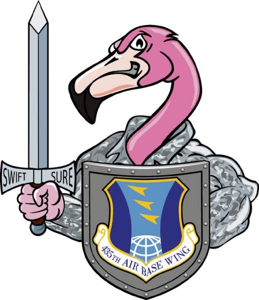 It is also this pink flamingo yard ornament that a 435th Air Base Wing Airman in the early 2000s poked at until it became very angry. His particular design took a mundane flamingo and made it into an imposing flamingo. After winning a wing design competition, this flamingo was incorporated into a morale patch of the 435 ABW.