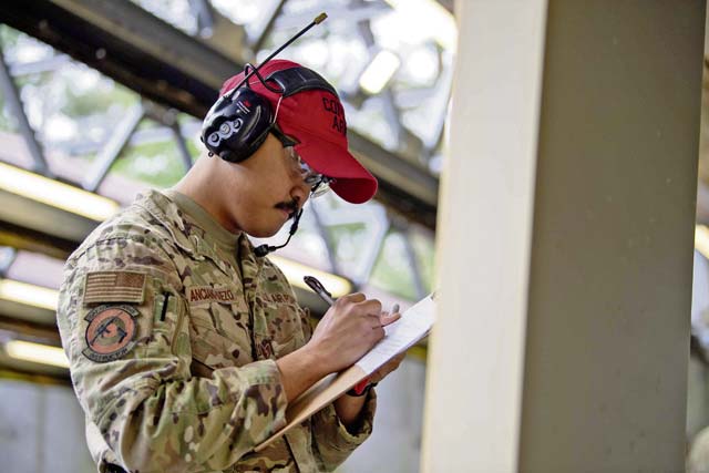 U.S. Air Force Staff Sgt. Victor N. Anciano-Suezo, 569th U.S. Forces Police Squadron combat arms instructor, marks competitor’s scores during the shooting competition at Ramstein Air Base, May 15.