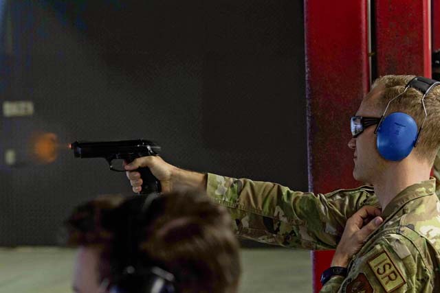 U.S. Air Force Capt. Tyler Housman, 86th Operation Support Squadron deputy flight commander, shoots a target at Kapaun Air Station, May 15.