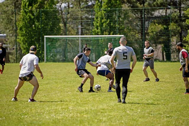 Police Week participants play a game of soccer during a sports day as part of the Kaiserslautern Military Community Police Week celebration at Ramstein Air Base, May 14. Defenders across the KMC celebrated Police Week through a series of challenges and events including an equipment demonstration, shooting competition, sports day and final guardmount ceremony to honor fallen security forces members.