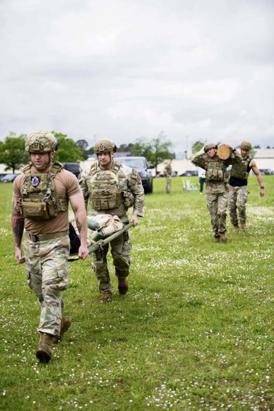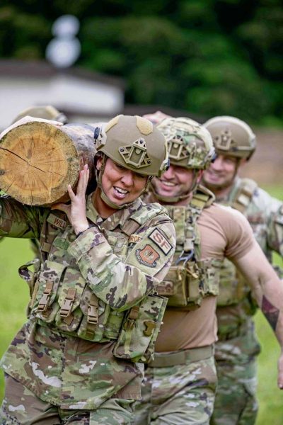 U.S. Air Force Airmen carry a log across a field at Ramstein Air Base, May 16.