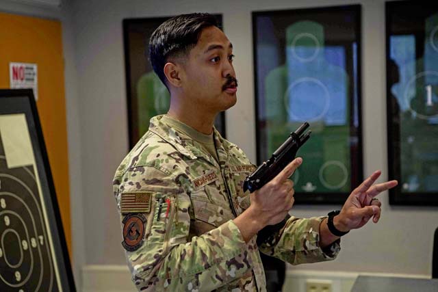 U.S. Air Force Staff Sgt. Victor Anciano-Suezo, 569th U.S. Forces Police Squadron combat arms instructor, explains shooting competition rules to participants at Ramstein Air Base, May 15. The 569th USFPS regularly conducts joint patrols off base with German Polizei and provides educational initiatives fostering police-community collaboration. Photos by Airman Dylan Myers