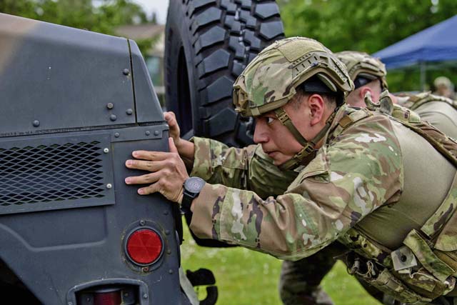 U.S. Air Force Senior Airman Marlon Yunga, 86th Security Forces Squadron member, pushes a HUMVEE during Defender Challenge at Ramstein Air Base, May 16. The 86th Security Forces Squadron regularly trains to produce proud, disciplined, mission-ready and resilient defenders.