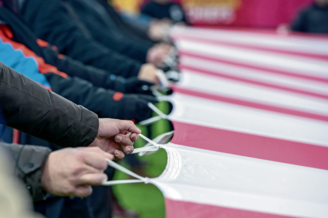 The U.S. flag is carried onto the field prior to a National Football League game in Frankfurt, Germany, Nov. 5, 2023. The NFL held its first-ever NFL game in the city, during which the Miami Dolphins squared off against the Kansas City Chiefs. (U.S. Air Force photo by Senior Airman Madelyn Keech)