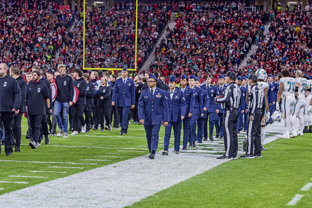 U.S. Air Force Airmen assigned to Ramstein Air Base, Germany, march onto the field prior to a National Football League game in Frankfurt, Germany, Nov. 5, 2023. U.S. and German military participation in the game between the Miami Dolphins and Kansas City Chiefs highlighted how shared values and commitment to collective defense unite Germany and the United States. (U.S. Air Force photo by Senior Airman Madelyn Keech)
