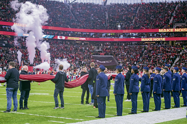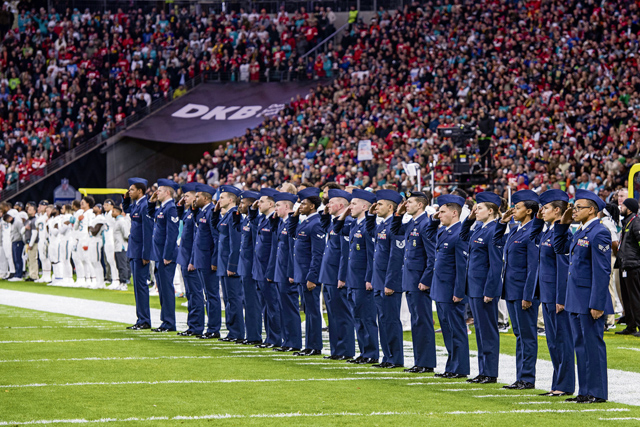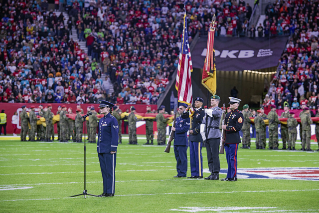 U.S. Air Force Airmen assigned to Ramstein Air Base, Germany, stand at attention on the field prior to a National Football League game between the Miami Dolphins and the Kansas City Chiefs in Frankfurt, Germany, Nov. 5, 2023. The United States stands united with our host-nation Germany in our combat-credible capability and resolve to deter aggression in the Euro-Atlantic region. (U.S. Air Force photo by Senior Airman Madelyn Keech)