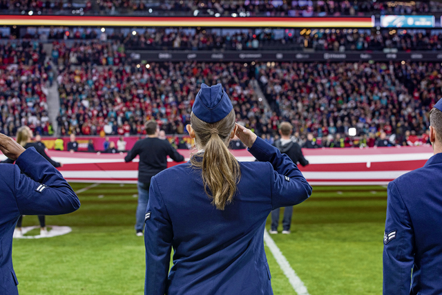 U.S. Air Force Airmen assigned to Ramstein Air Base, Germany, salute the U.S. and Germany flags during the playing of the U.S. and German national anthems prior to a National Football League game in Frankfurt, Germany, Nov. 5, 2023. The game between the Miami Dolphins and Kansas City Chiefs was the first in a two-game NFL series in Germany. (U.S. Air Force photo by Senior Airman Madelyn Keech)