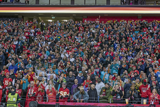 Football fans cheer following the playing of the U.S. and German national anthems during a National Football League game in Frankfurt, Germany, Nov. 5, 2023. Approximately 50,000 spectators attended the first-ever NFL game in the city, during which the Miami Dolphins squared off against the Kansas City Chiefs. (U.S. Air Force photo by Senior Airman Madelyn Keech)