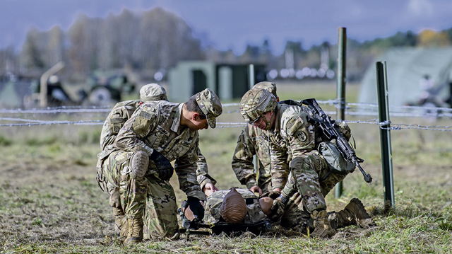 U.S. Army Capt. Jacob Karem, assigned to the 30th Medical Brigade, 21st Theater Sustainment Command, transports a casualty using the four-person carry, low crawl carry while competing to earn his Expert Field Medical Badge on Vilseck, Germany Nov. 7, 2023. Candidates must transport a casualty using the four-person carry, low crawl carry, semi-overhead carry, and one unit selected carry without causing further injury to the casualty during the E3B, which is the Expert Soldier Badge (ESB), Expert Field Medic Badge (EFMB) and Expert Infantry Badge (EIB).