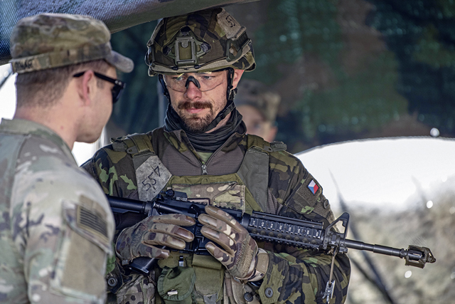 U.S. Army Spc. John Synar (left), assigned to Troop K, 3rd Squadron, 2nd Cavalry Regiment, grades Czech army soldier, Master Sgt. Jan Ledvina (right) as he clears an M4 carbine during the weapons lanes qualification at the U.S. Army Europe Expert Infantryman, Expert Soldier and Expert Field Medical Badges, also known as E3B, at Vilseck, Germany, Nov. 8, 2023. As a prerequisite to competing, the competitors must have qualified expert with the M4 Carbine or M16 Rifle on a 300-meter range within six months of testing for the E3B. The E3B is designed to test candidates’ physical and mental abilities to increase unit readiness while executing critical individual and technical tasks while maintaining the integrity and history of each badge.