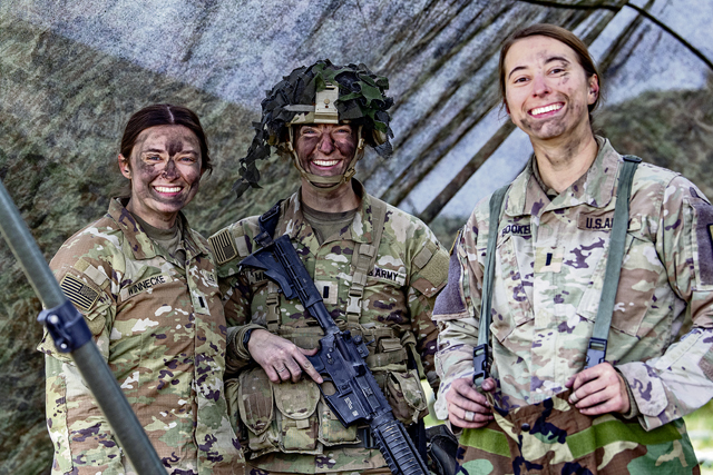 (From left to right) U.S. Army 1st Lt. Katlyn Winnecke, 1st Lt. Shawna Mumma, and 1st Lt. Emily Booker, pose for a photo at the Expert Field Medical Badge Warrior Skills lane, Nov. 8, 2023, on Vilseck, Germany. All three Soldiers participated in the U.S. Army Europe Expert Infantryman, Expert Soldier and Expert Field Medical Badges, also known as E3B, at Vilseck, Germany, Nov. 8, 2023. The E3B is designed to test candidates’ physical and mental abilities to increase unit readiness while executing critical individual and technical tasks while maintaining the integrity and history of each badge. (U.S. Army photo by Staff Sgt. Daniel Yeadon).