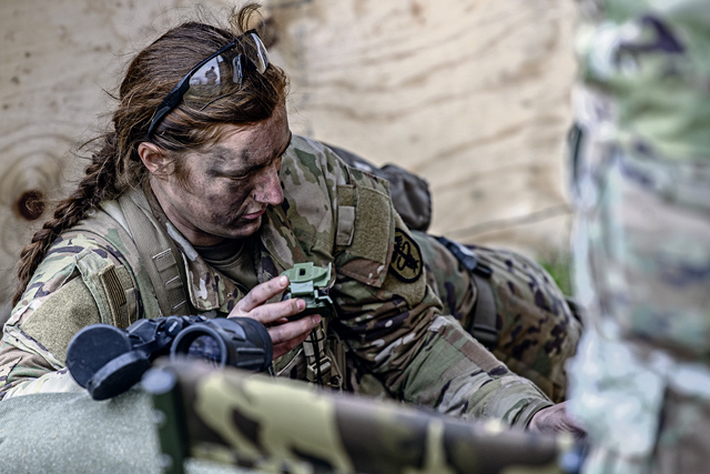 A U.S. Army Soldier checks her compass while she conducts a spot report with a tactical radio during testing for the Expert Field Medical Badge at Vilseck, Germany Nov. 8, 2023. This event was part of U.S. Army Europe Expert Infantryman, Expert Soldier and Expert Field Medical Badges, also known as E3B, designed to test candidates’ physical and mental abilities to increase unit readiness while executing critical individual and technical tasks while maintaining the integrity and history of each badge. (U.S. Army photo by Staff Sgt. Daniel Yeadon).