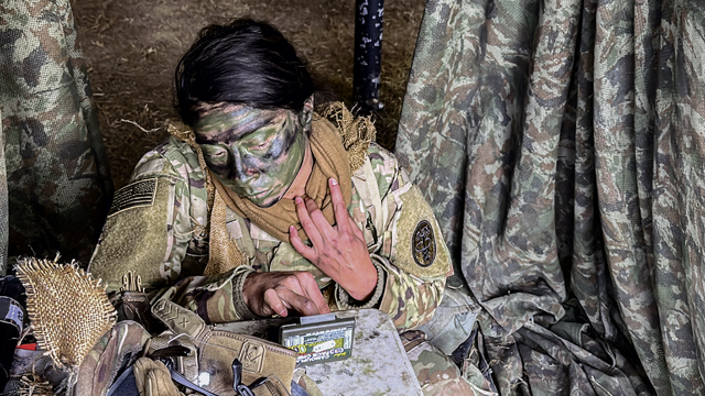 U.S. Army Sgt. Tanya Alvarado, 30th Medical Brigade, 21st Theater Sustainment Command, fixes her face paint during the camouflage and concealment task of the Expert Field Medical Badge Warrior Skills lane, during the U.S. Army Europe Expert Infantryman, Expert Soldier and Expert Field Medical Badges, also known as E3B, at Vilseck, Germany, Nov. 8, 2023. The E3B is designed to test candidates’ physical and mental abilities to increase unit readiness while executing critical individual and technical tasks while maintaining the integrity and history of each badge. The Expert Infantryman Badge was created in 1944 to honor the U.S. Army Infantryman and serve as a symbol of their role in combat and proficiency in the Infantry arts. The Expert Field Medical Badge was established in 1965 for all officers, warrant officers and enlisted personnel in the Army Medical Department Corps as a method to show their high level of proficiency on the battlefield. The Expert Soldier Badge was established in 2019 on the Army’s 244th Birthday to highlight lethality and preparedness outside the Infantry, Special Operations and Medical branches. All three of these badges are highly competitive, and only a select few meet every challenge and earn the right to wear the badge. (U.S. Army photo by Staff Sgt. Daniel Yeadon).