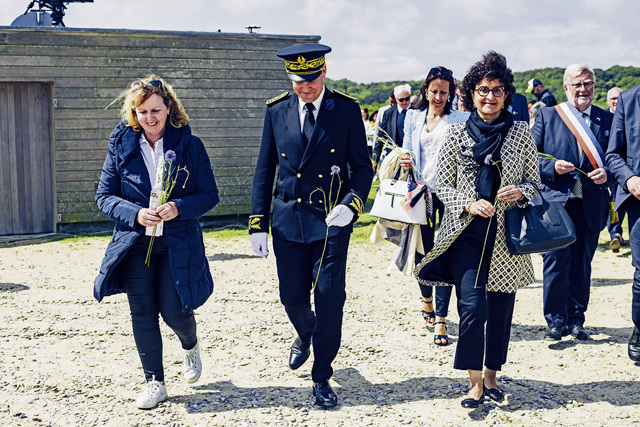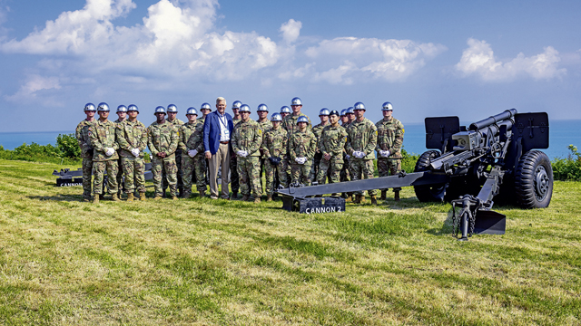 Military Police Officers from the 529th Military Police Company, 709th Military Police Battalion, 18th Military Police Brigade, attended the 80th D-Day Anniversary and take a photo with Navy personnel, alongside their cannons at Normandy American Cemetery and Memorial on Omaha Beach, Colleville-sur-Mer, France, June 6. Photo by Staff Sgt. Tanisha Karn