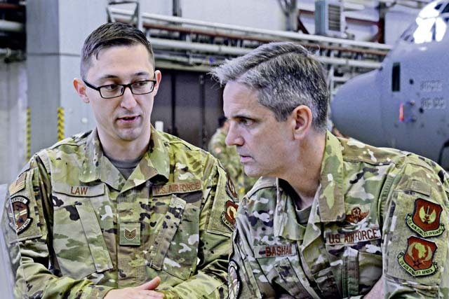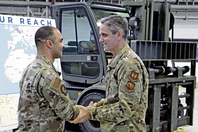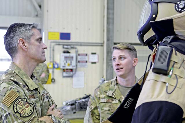 U.S. Air Force Lt. Gen. Steven Basham, U.S. Air Forces in Europe-Air Forces Africa deputy commander, left, connects with Staff Sgt. Michael Long, 786th Civil Engineer Squadron explosive ordnance disposal craftsman, in a hangar during a base tour of Ramstein on Jan. 17. Long showed Basham some of the latest gear used by the EOD team and shared some of the history behind the equipment.