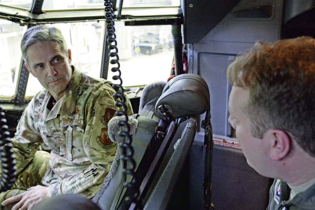 U.S. Air Force Lt. Gen. Steven Basham, U.S. Air Forces in Europe-Air Forces Africa deputy commander, left, speaks with an 86th Airlift Wing Airman aboard a C-130J Super Hercules aircraft during an immersion tour at Ramstein Air Base, Jan. 17. The tour allowed Basham to engage with Airmen and learn how they specifically contribute to the mission.