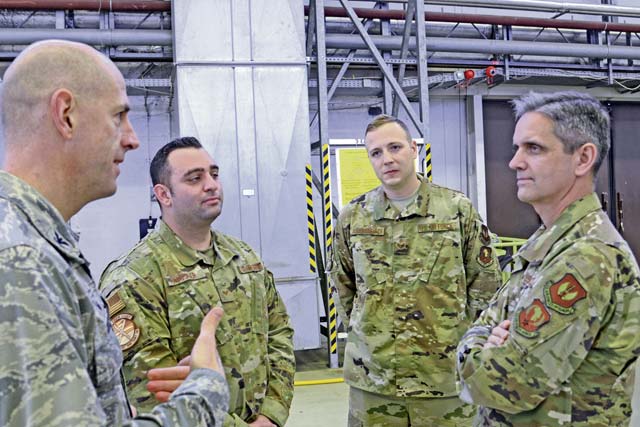 U.S. Air Force Col. John Knack, 86th Maintenance Group commander, far-left, meets Lt. Gen. Steven Basham, U.S. Air Forces in Europe-Air Forces Africa deputy commander, right, during a capabilities tour at Ramstein Air Base, Jan. 17. Basham listened to how the group operates, and also took suggestions on how to manage future expectations based on current capabilities.