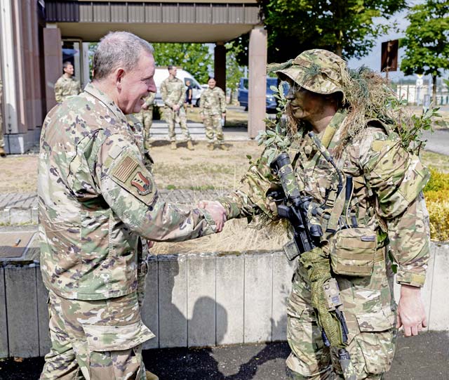 U.S. Air Force Gen. James B. Hecker, U.S. Air Forces in Europe-Air Forces Africa commander, coins Tech. Sgt. Ryan Wooden, 2nd Air Support Operations Squadron Tactical Air Control Party student, during an immersion tour at Ramstein Air Base, Aug. 31. The immersion tour allowed leadership to receive mission updates from various units within the 435th Air Ground Operations Wing.
