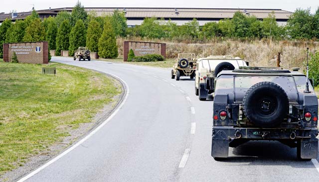 A convoy escorting U.S. Air Force Gen. James B. Hecker, U.S. Air Forces in Europe-Air Forces Africa commander, drives to the 435th Air Ground Operations Wing expeditionary complex at Ramstein Air Base, Aug. 31. The 435th AGOW builds expeditionary airfields on demand, provides joint airpower integration, enables multi-theater sustainment and support, delivers premier specialty training and builds partner capacity.