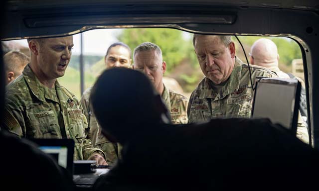 U.S. Air Force Gen. James B. Hecker, U.S. Air Forces in Europe-Air Forces Africa commander, tours the 1st Combat Communications Squadron’s radar communication technology at Ramstein Air Base, Aug. 31. Hecker toured multiple units under the 435th Air Ground Operations Wing to learn more about their capabilities. The mission of the 1st CBCS is to deploy rapidly, operate and maintain command, control, communications and computer systems at any time and location around the globe.
