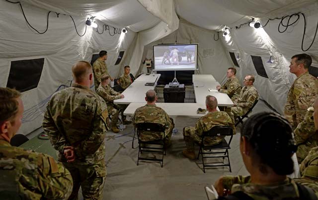 U.S. Air Force Gen. James B. Hecker, U.S. Air Forces in Europe-Air Forces Africa commander, listens to wing capabilities presentation with Airmen assigned to the 435th Air Ground Operations Wing at Ramstein Air Base, Aug. 31. Hecker toured multiple units under the 435th AGOW to learn more about their missions and capabilities.