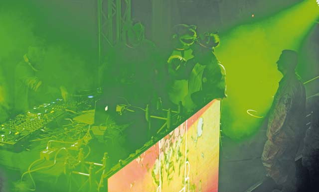 Members of the KMC talk with disc jokey SuperVision as he plays for service members Jan. 30 on Ramstein. DJ SuperVision and three other DJs played for Airmen, Soldiers and civilians on base as part of a USO Electronic Dance Music tour.