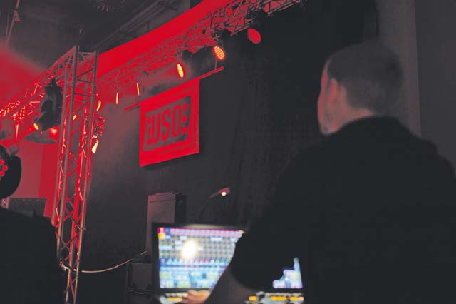A technician for the USO Electronic Dance Music tour manages the light display as a disc jockey plays for service members on Ramstein.