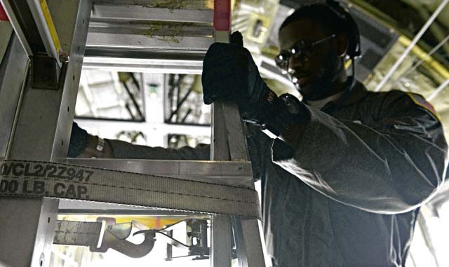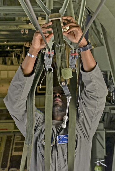 Senior Airman Brandon Ravenell, 37th Airlift Squadron loadmaster, prepares a C-130J Super Hercules for flight during exercise Carpathian Spring May 10 on Otopeni Air Base, Romania. The U.S. and Romania mutually benefit from exercises such as this by developing and improving air readiness.