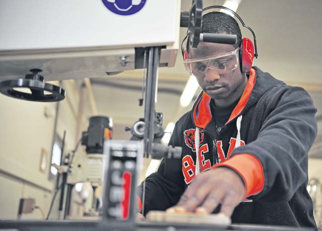 Army Sgt. Darrell Smith, 11th Missile Defense Detachment operation assistant, cuts a piece of lumber for a project May 2 at the Ramstein Arts and Crafts Center woodshop.