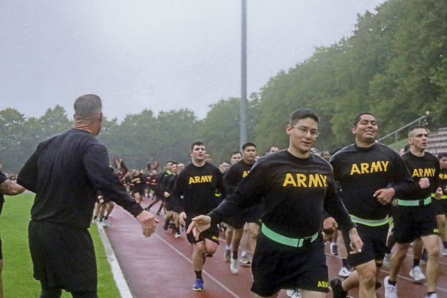 U.S Army Col. Christopher Richardson, commander, 16th Sustainment Brigade, cheers on fellow U.S. Army Soldiers assigned to units participating in the 16th SB led 9/11 remembrance run, held on 11 September 2025.